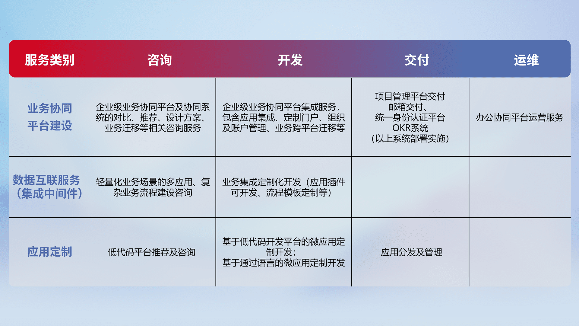 针对钉钉、、、企微、、IDaas等平台级产品提供产品的规划、、、、方案、、、交付、、定制化开发等服务,,实现如统一协同办公、、智能客户服务、、混合会议管理、、智能数据查询、、、等业务场景,,,,实现数字化转型。。。。