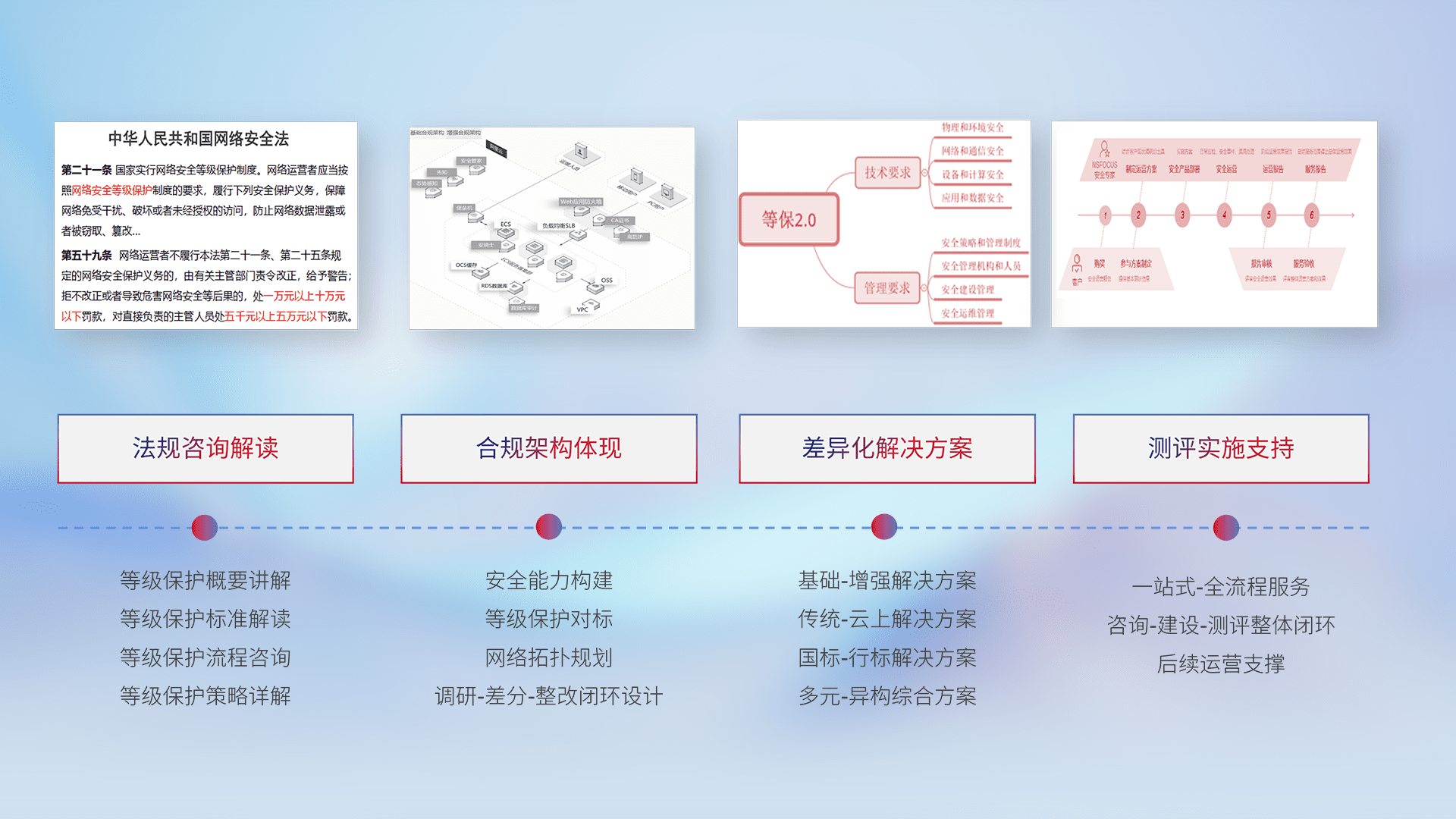 通过专业的法律咨询解读、、、、合规架构体现、、、、差异化解决方案、、测试实施支持等服务,,,为客户量身打造等保合规体系。。。。